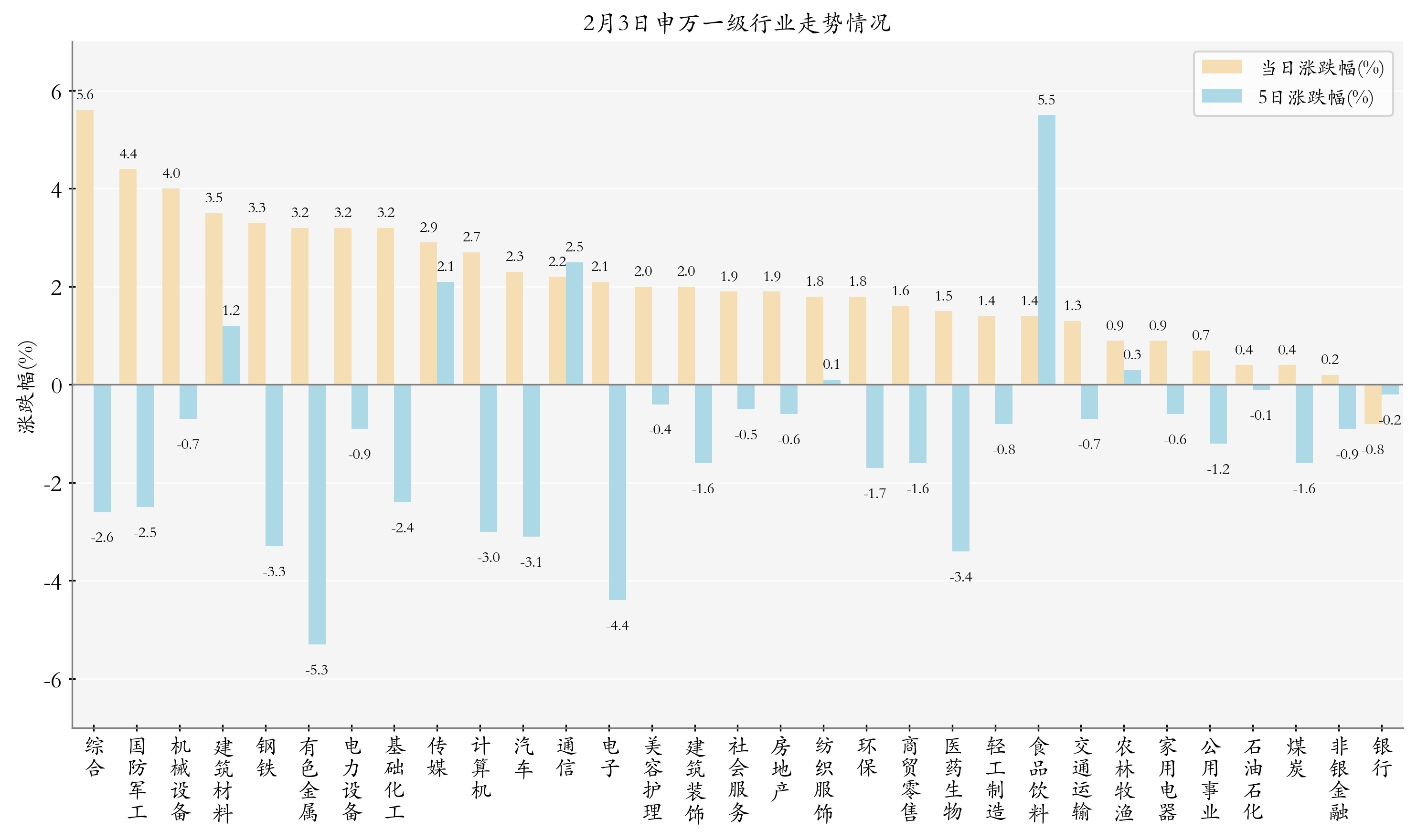 统计今日全部申万一级行业涨跌幅情况,综合、国防军工与机械设备今日走势排名靠前,日涨跌幅分别为5.63%、4.42%与3.98%,银行、非银金融与煤炭的走势排名靠后,日涨跌幅分别是-0.85%、0.17%与0.38%;近5个交易日食品饮料、通信与传媒的走势排名靠前,近5日涨跌幅分别为5.5%、2.54%与2.14%,有色金属、电子与医药生物的走势排名靠后,近5日涨跌幅分别为-5.3%、-4.44%与-3.4%。