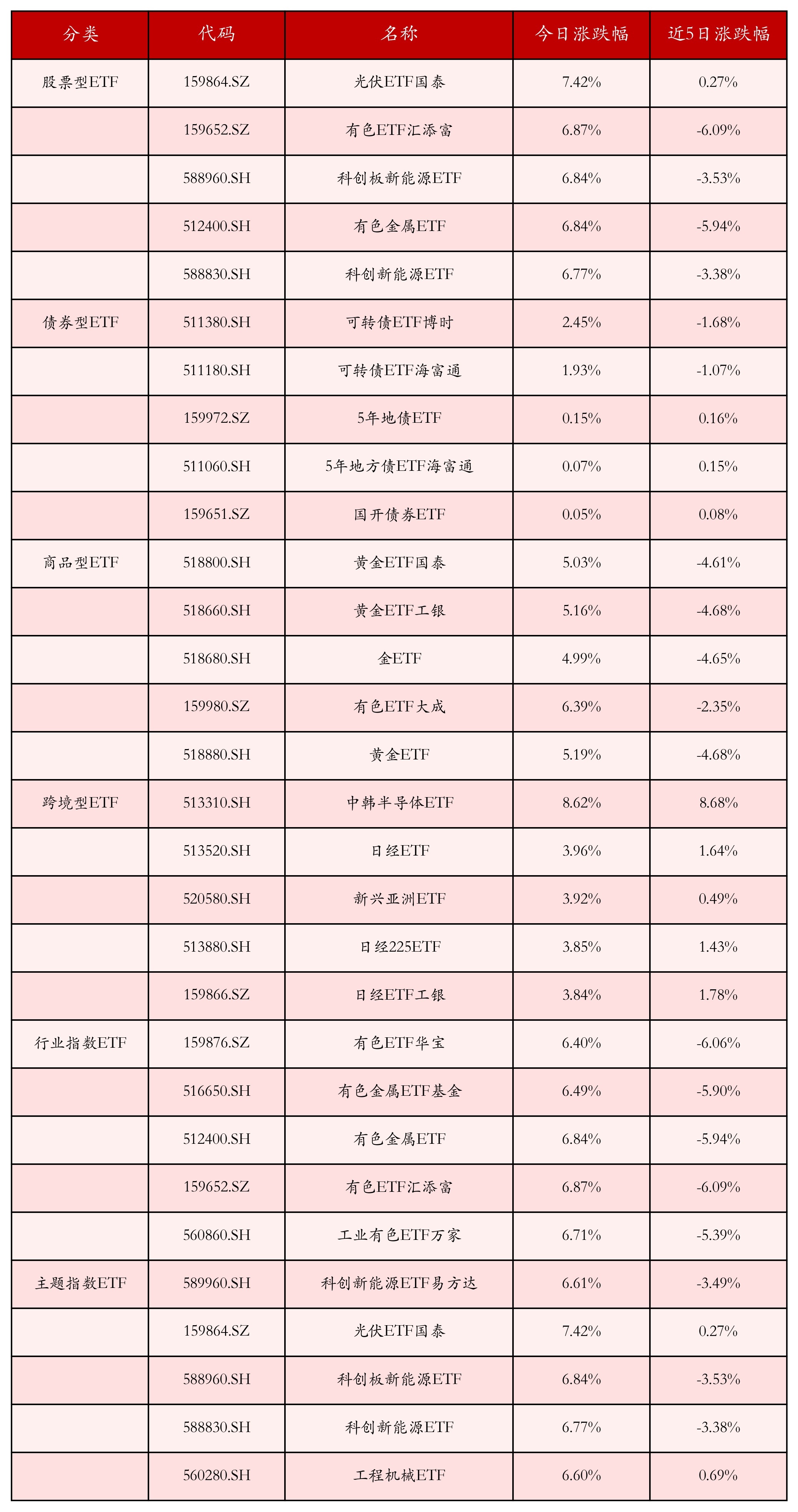 从不同投资种类、行业、主题的ETF产品中找出今日走势行情排名前5的ETF基金,今日涨幅靠前的ETF产品如下表所示。股票型ETF中涨跌幅排名前3位的ETF产品分别为光伏ETF国泰(159864.SZ)、有色ETF汇添富(159652.SZ)和科创板新能源ETF(588960.SH),今日收益率分别为7.42%、6.87%和6.84%。