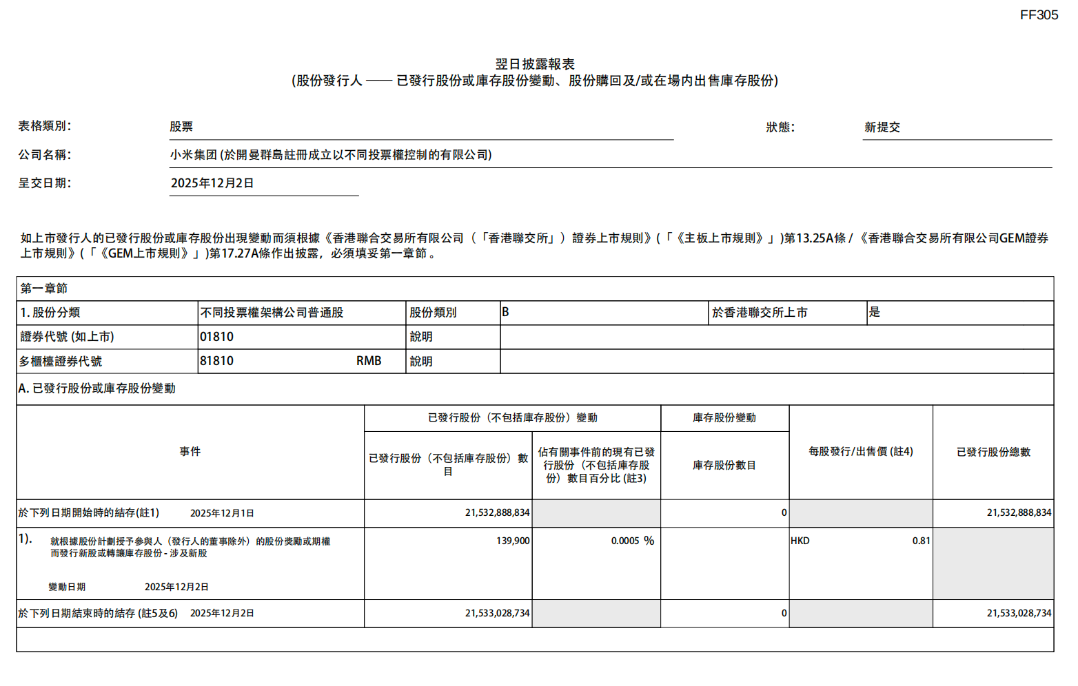 上证报中国证券网讯(记者 刘暄)12月2日,小米集团在港交所发布公告,以平均价40.62港元再次回购250万股,总金额1.02亿港元。两周之内,小米集团已经七次回购股票,累计回购金额超20亿港元。